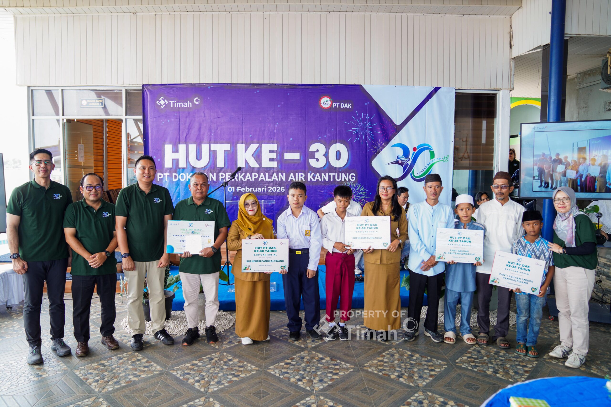 Pangkalpinang, nidianews.com – Memperingati usia tiga dekade, PT Dok dan Perkapalan Air Kantung (PT DAK), anak usaha PT TIMAH Tbk, terus menegaskan komitmennya dalam menjalankan peran sosial perusahaan. Dalam peringatan HUT ke-30 PT DAK, perusahaan menggelar berbagai kegiatan sosial seperti donor darah serta menyalurkan bantuan Tanggung Jawab Sosial dan Lingkungan (TJSL) kepada sekolah luar biasa (SLB) dan panti asuhan di wilayah Bangka dan Lombok pada Senin (2/2/2026).
